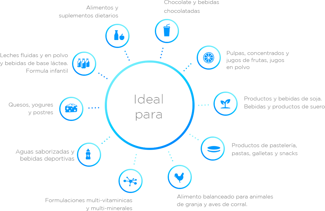 Nuestras sales minerales no solo otorgan valor agregado a los productos de nuestros clientes al proveerles propiedades nutricionales especificas, sino que también permiten hacer un enfoque en necesidades nutricionales especiales logrando un mejor posicionamiento en el mercado.